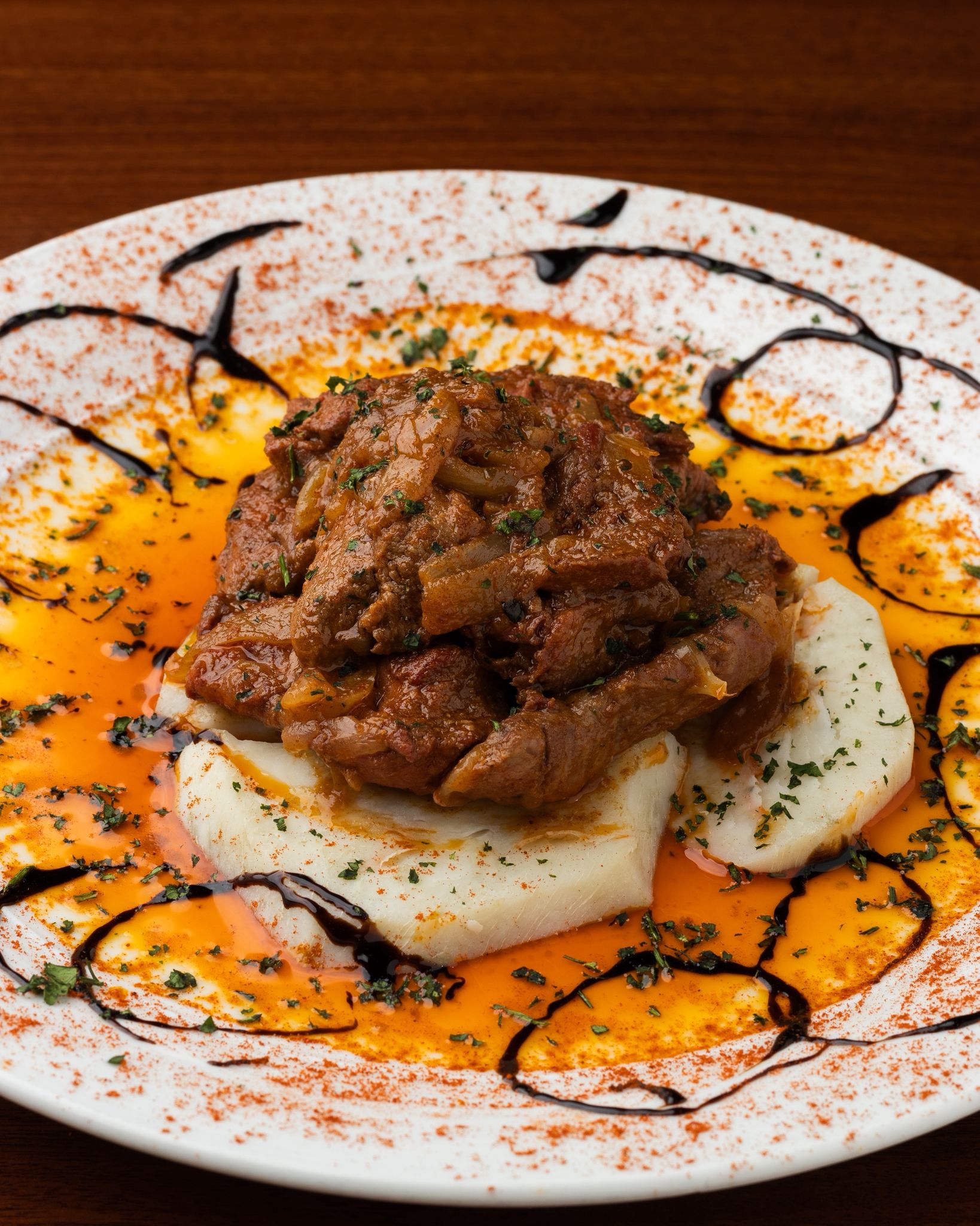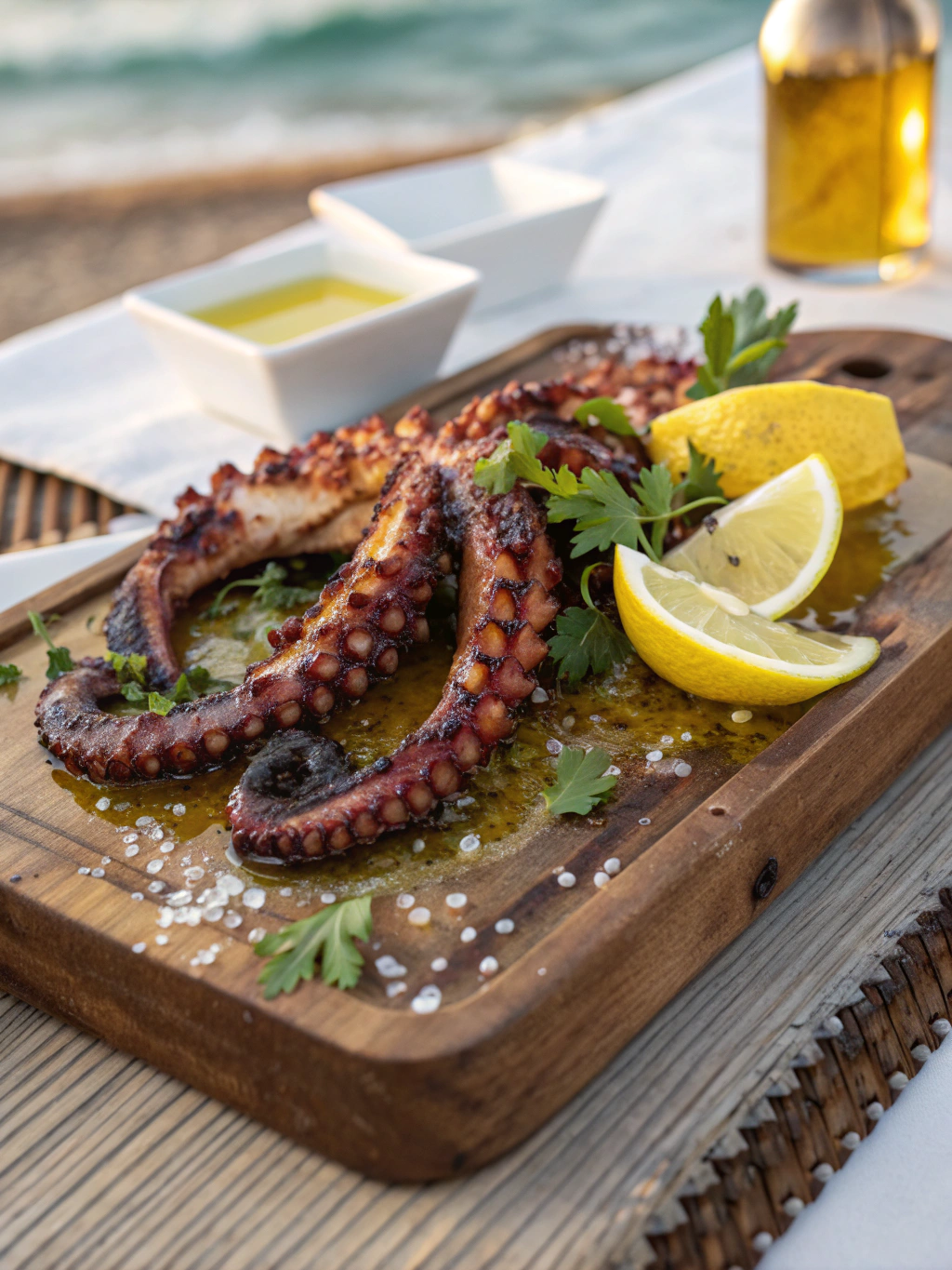 Pulpo tierno sobre patatas con pimentón de la Vera, aceite de oliva virgen extra y un toque de sal marina. Un clásico que rinde homenaje a la cocina tradicional española.