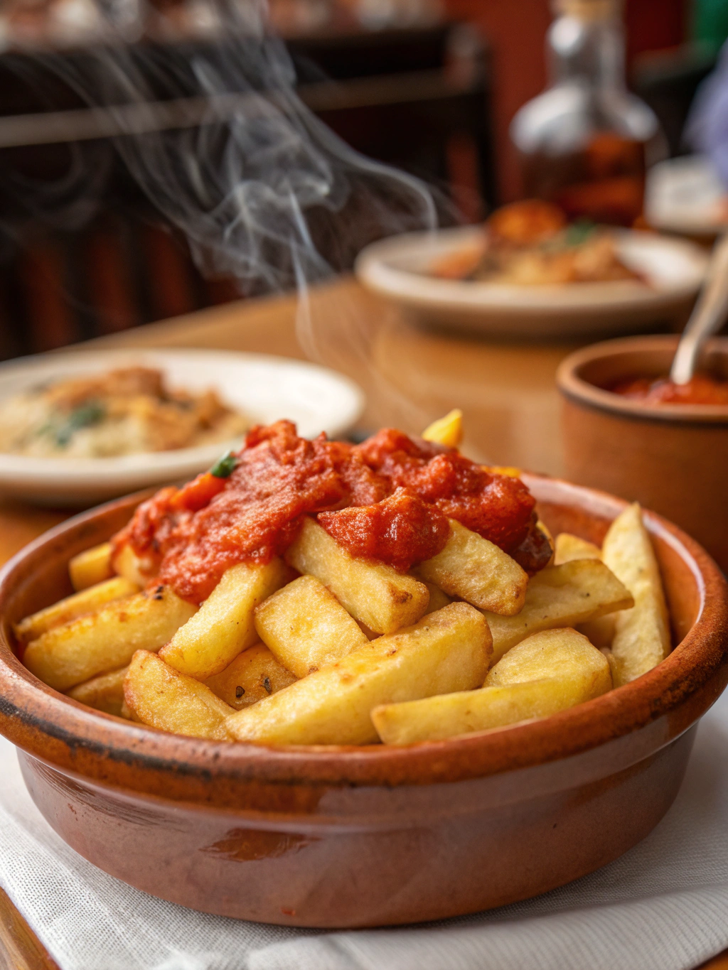 Papas canarias cocidas en agua salada, servidas con mojo picón y mojo verde caseros. Ingredientes locales que celebran el sabor auténtico de las islas.